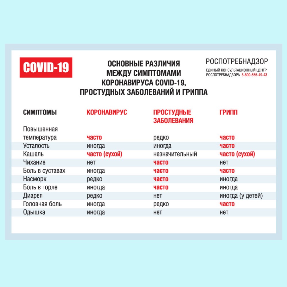 Основные различия между симптомами коронавируса COVID-19, простудных заболеваний и гриппа.