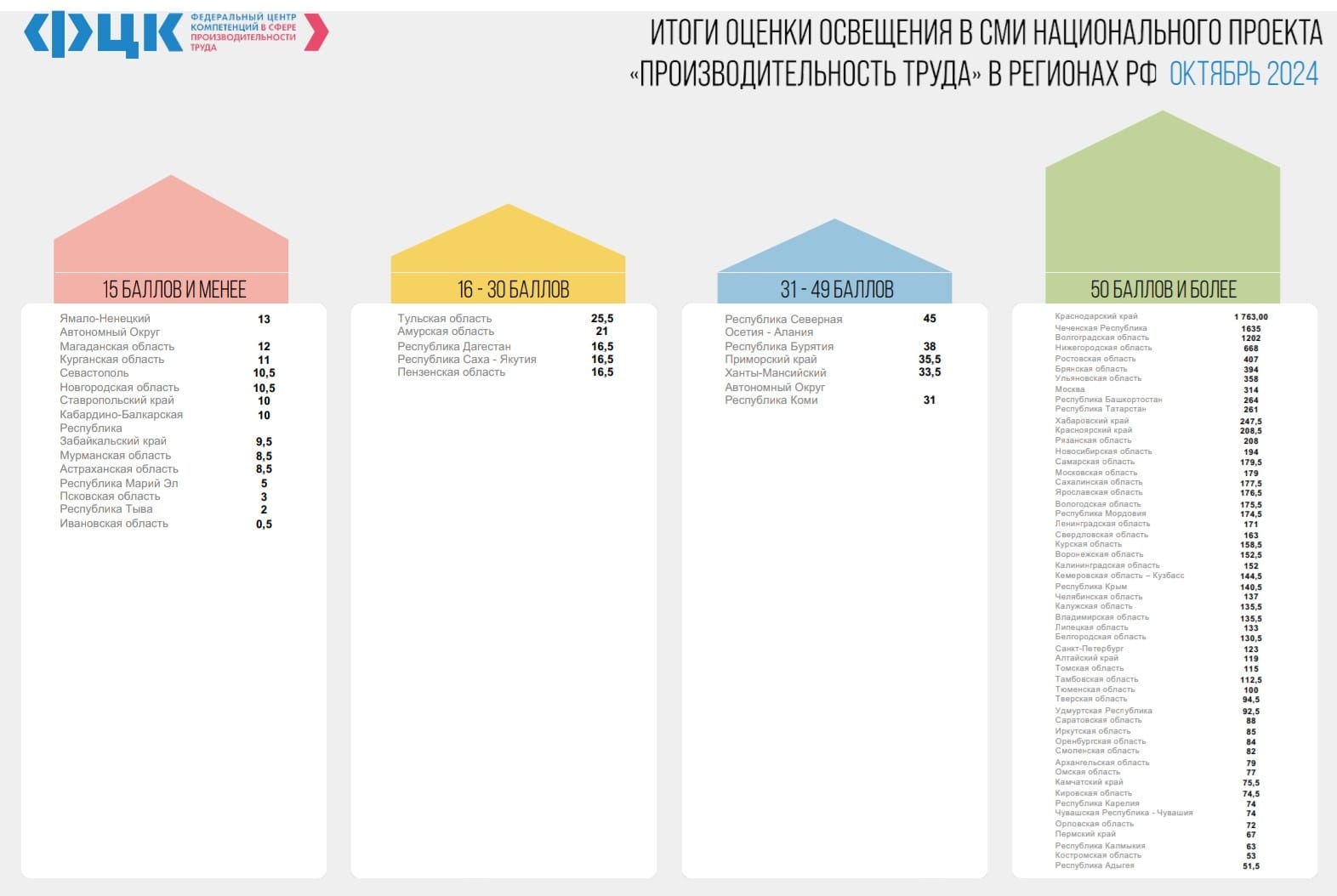 По итогам подведенным ФЦК за октябрь 2024 года, Чеченская Республика вошла в лидирующую группу и заняла второе место, уступив лишь Краснодарскому краю.