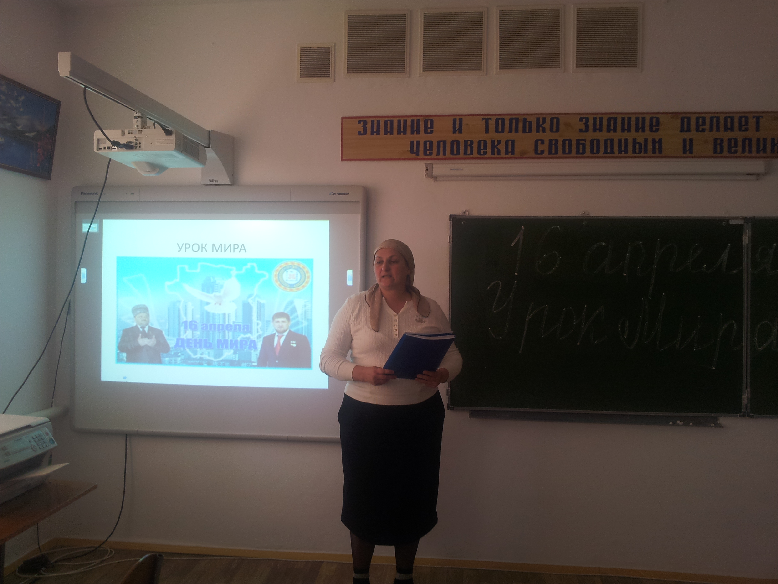 15.04.201515 апреля 2015г. в МБОУ «СОШ с. Давыденко» был проведен «Урок мира», посвященный Дню отмены контртеррористической операции в Чеченской Республике. Также были проведены классные часы с 1-11 классах на тему: «День мира в ЧР». Были представлены слайды, презентации по данной тематике.